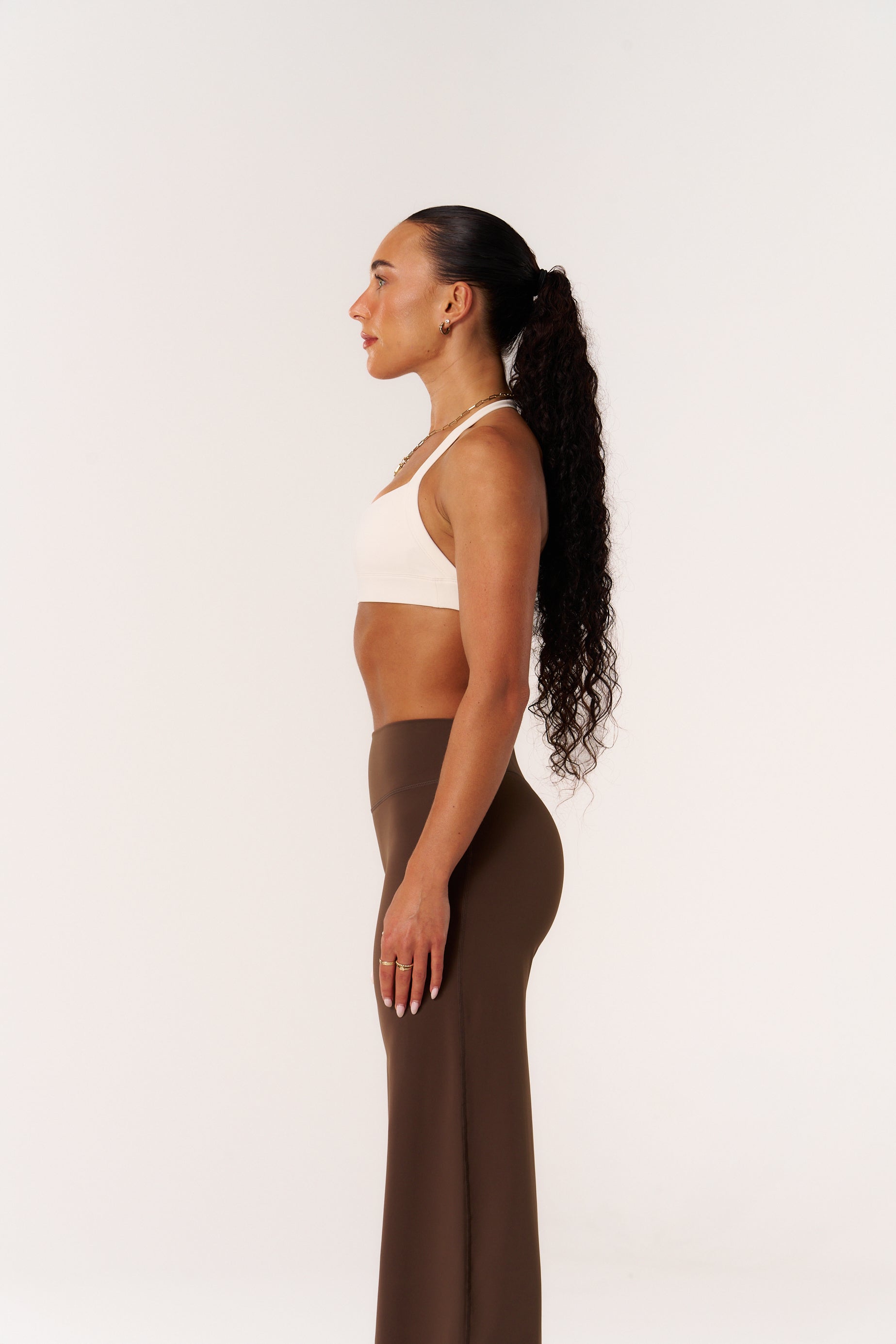 The mid-rise waistband sits comfortably at the hip, creating a flattering line through the waist and legs without sacrificing versatility or comfort.